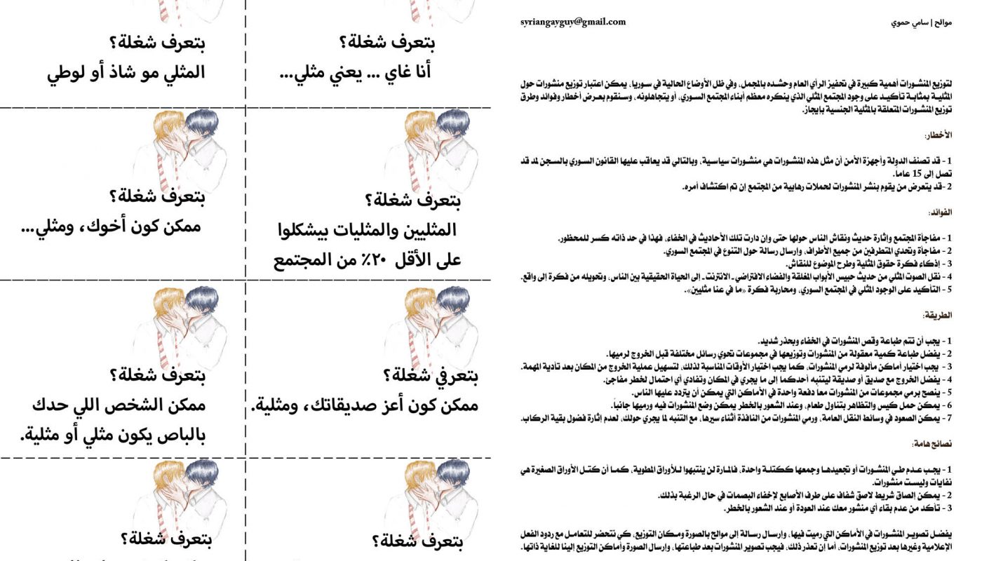 لتوزيع المنشورات أهمية كبيرة في تحفيز الرأي العام وحشده بالمجمل، وفي ظل الأوضاع الحالية في سوريا، يمكن اعتبار توزيع منشورات حول المثلية بمثابة تأكيد على وجود المجتمع المثلي الذي ينكره معظم أبناء المجتمع السوري، أو يتجاهلونه، وسنقوم بعرض أخطار وفوائد وطرق توزيع المنشورات المتعلقة بالمثلية الجنسية بإيجاز.