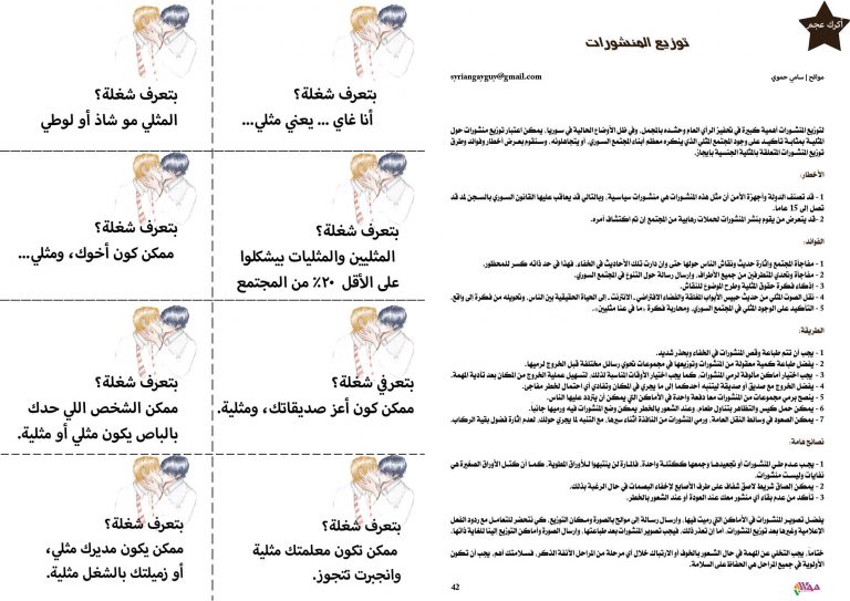 لتوزيع المنشورات أهمية كبيرة في تحفيز الرأي العام وحشده بالمجمل، وفي ظل الأوضاع الحالية في سوريا، يمكن اعتبار توزيع منشورات حول المثلية بمثابة تأكيد على وجود المجتمع المثلي الذي ينكره معظم أبناء المجتمع السوري، أو يتجاهلونه، وسنقوم بعرض أخطار وفوائد…